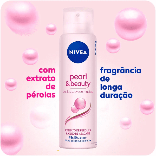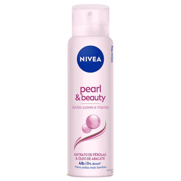 Desodorante aerossol antitranspirante. NIVEA Pearl & Beauty garante máxima eficácia contra o suor e os maus odores. O Desodorante Antitranspirante Aerossol NIVEA Pearl & Beauty é enriquecido com Extrato de Pérolas, que proporciona axilas mais atraentes e uniformizadas, sobretudo após a depilação. Além disso, sua fórmula também conta com o Óleo de Abacate, que oferece proteção completa e duradoura contra a transpiração, com efeito de até 48h.