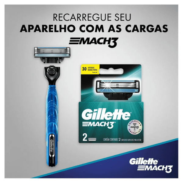 O Aparelho de Barbear Recarregável Mach3 Acqua-Grip da Gillette é produzido com 03 lâminas e vem com 01 unidade com 01 carga. O produto possui compatibilidade com as lâminas Mach3, e agora conta com um cabo Acqua-Grip de 360°para controle total no uso, mesmo úmido. Para uma experiência mais suave, o modelo traz uma fita lubrificante para proteger contra vermelhidão e que facilita o deslizamento, sendo indicado para peles normais, e uma cabeça móvel que se ajusta aos contornos do seu rosto e molas independentes distribuem a pressão no cartucho, proporcionando conforto e nivelamento. Ainda possui 10 micro estabilizadores que esticam a pele, oferecendo suavidade sem esforço. E para ser bem prático, esse modelo é de fácil enxágue e limpeza.