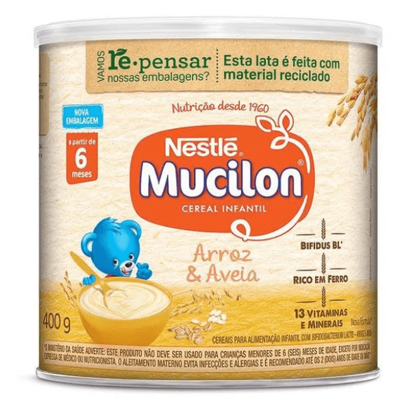 Mucilon® de Arroz e Aveia Integral* é um cereal infantil que é rico em nutrientes que contribuem para a Imunidade² e Desenvolvimento Cerebral³. ²Vitaminas A, C, D, E, B6, B9 (ácido fólico), ferro e zinco. ³O Ferro e o Zinco ajudam nos processos responsáveis pelo desenvolvimento adequado do cérebro. *Este produto é feito com aveia integral (14%)