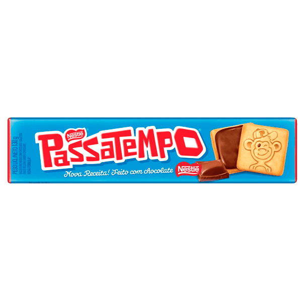 “O seu PASSATEMPO com a inconfundível casquinha branca, gostinho de leite e desenhos que estimulam a imaginação da criançada. CONTÉM GLÚTEN. Ingredientes: Farinha de trigo enriquecida com ferro e ácido fólico, açúcar, óleo vegetal, minerais cálcio e zinco (carbonato de cálcio e sulfato de zinco), leite em pó integral (1,5%), sal, amido, farinha de aveia, fermentos químicos (bicarbonato de amônio, fosfato monocálcico e bicarbonato de sódio), aromatizantes, emulsificante (lecitina de soja) e corantes naturais (carmim e clorofilina cúprica) e corante caramelo III.”