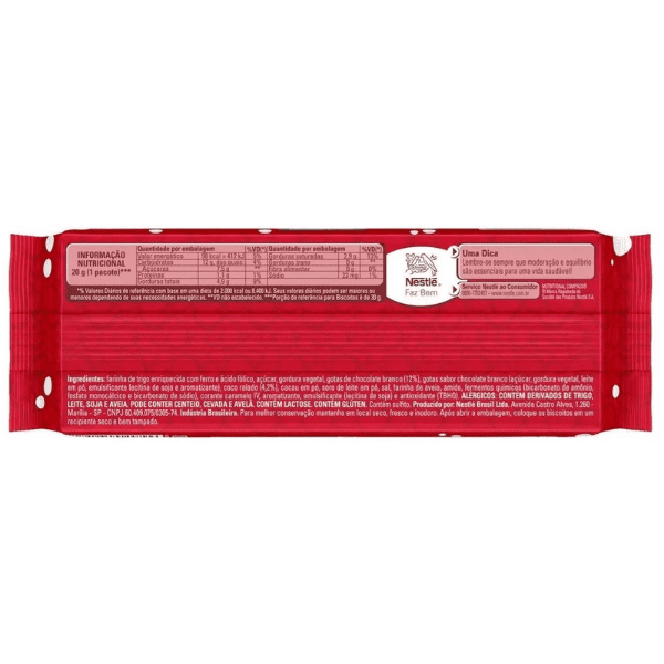 Cookie Nestlé Prestígio, deliciosa massa crocante, gotas do tradicional chocolate branco Nestlé e coco ralado. Embalagem de 60g contendo 6 unidades. São 3 pacotes com 2 cookies cada.
