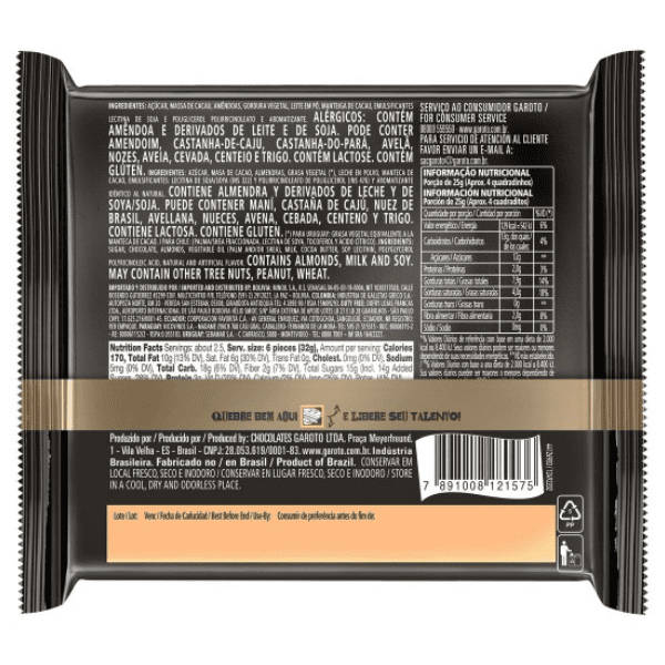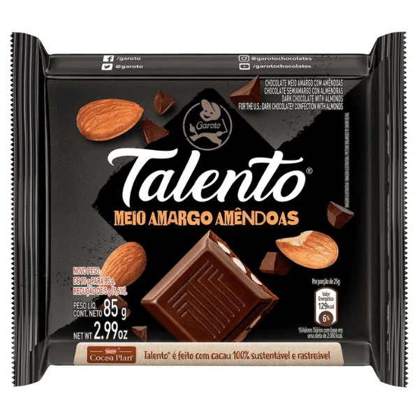 O Chocolate Meio Amargo Amêndoas Talento Garoto é delicioso, sofisticado, elegante, irresistível… Talento Meio Amargo Amêndoas é um delicioso chocolate Garoto com alto teor de cacau e é enriquecido com pedaços de amêndoas, deixando seu sabor ainda mais intenso.