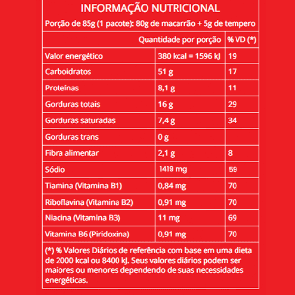 Ingredientes do Macarrão: farinha de trigo enriquecida com ferro e ácido fólico, gordura vegetal, sal, vitaminas B3 (niacina), B6 (piridoxina), B2 (riboflavina) e B1 (tiamina), reguladores de acidez carbonato de potássio e carbonato de sódio, estabilizantes tripolifosfato de sódio, pirofosfato tetrassódico e fosfato de sódio monobásico e corante sintético idêntico ao natural betacaroteno.