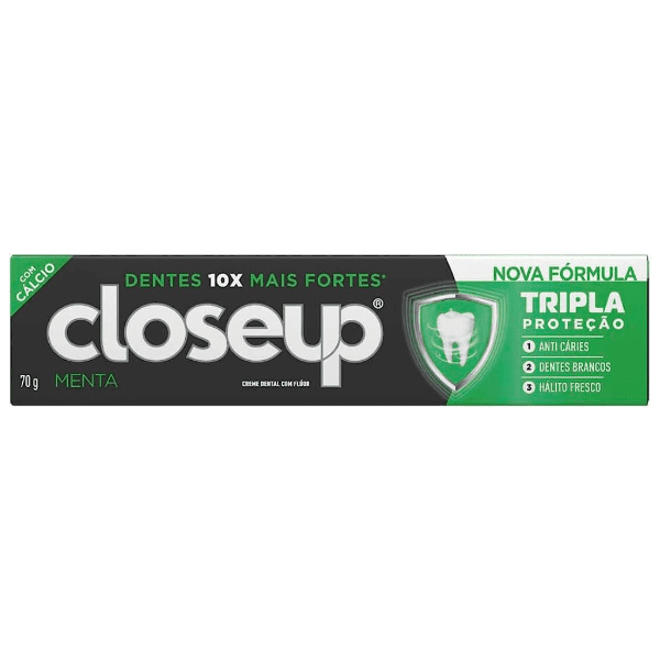 O Creme Dental Closeup Tripla Proteção Menta proporciona dentes 10x mais fortes* • Sua fórmula possui tripla proteção: anticáries, dentes brancos e hálito fresco.