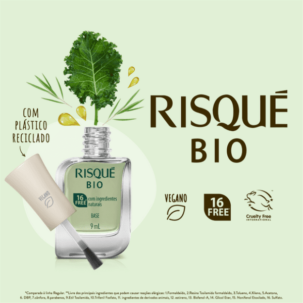 A nova linha Risqué BIO é cruelty-free e vegana, possui fórmula hipoalergênica e 16-free. A Base Couve Kale possui cobertura transparente natural e deve ser aplicada para preparação das unhas antes da esmaltação.