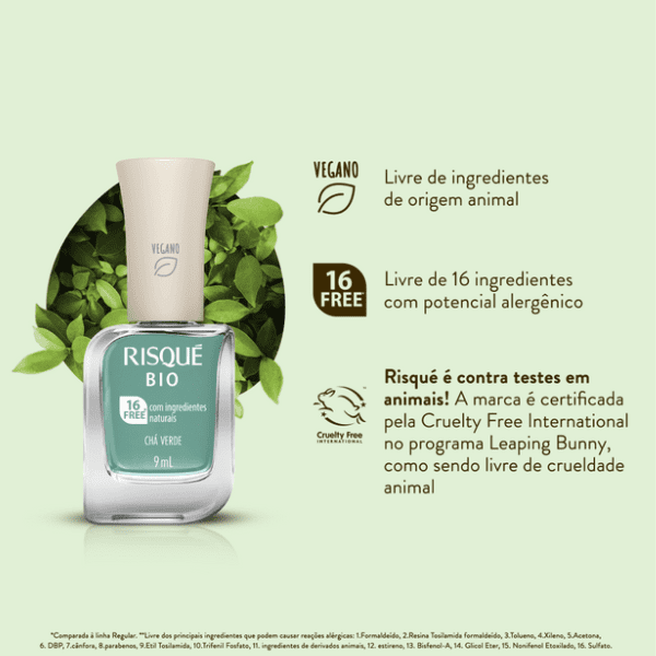 A nova linha Risqué BIO é cruelty-free e vegana, possui fórmula hipoalergênica e 16-free. O esmalte Chá Verde possui coloração verde e textura cremosa, além de ter longa duração nas unhas, alta cobertura e secagem rápida.