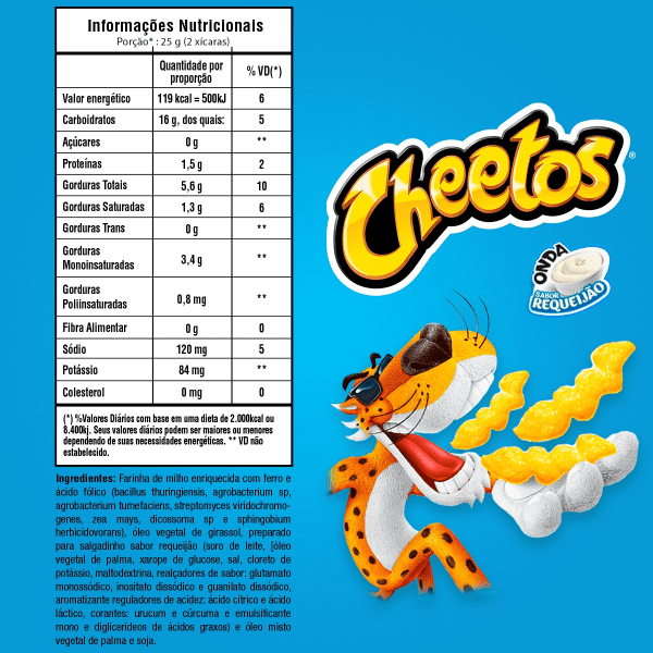 CHEETOS é a marca líder no mercado de salgadinhos no Brasil, logo, no segmento de extrusados. Feito à base de milho, assado e sempre entrega uma explosão de sabor. Sempre traz inovação e diversão entre amigos e família com os deliciosos salgadinhos e o querido Chester Cheetah.