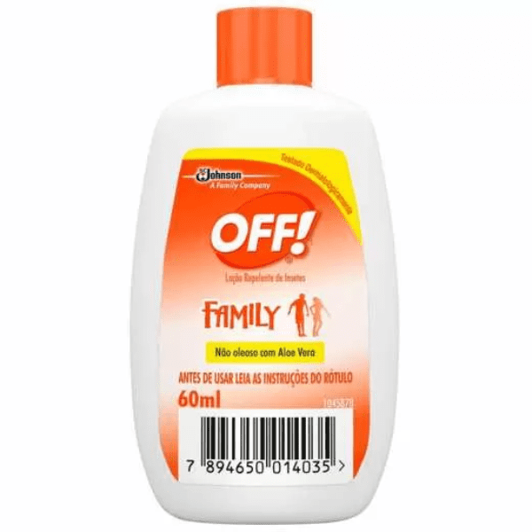OFF! Family Loção é dermatologicamente testado e foi desenvolvido para ser usado por toda a família (crianças acima de 2 anos). Sua fórmula não oleosa, possui Aloe Vera e protege por 4 horas, garante proteção contra mosquitos, inclusive contra o aedes aegypti, mosquito que pode transmitir o Zika vírus, a Dengue, a febre Chikungunya e a Febre Amarela.