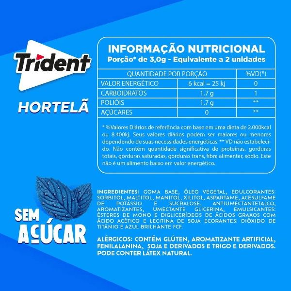 Em uma goma super macia, Trident te ajuda a tornar o dia mais leve e divertido! A goma de mascar mais consumida pelos brasileiros destrava pequenos momentos de tensão a cada mascada. Trident Spearmint possui sabor revigorante em um chiclete zero açúcar, com cristais que oferecem refrescância.