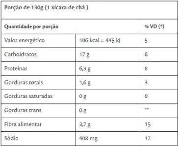 – Grão de bico, salmoura (água e sal) e antioxidante EDTA cálcio dissódico. NÃO CONTÉM GLÚTEN. ALÉRGICOS: PODE CONTER SOJA.