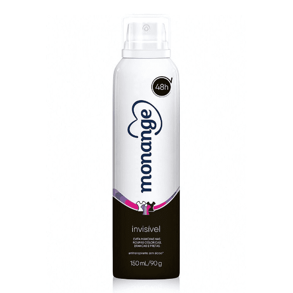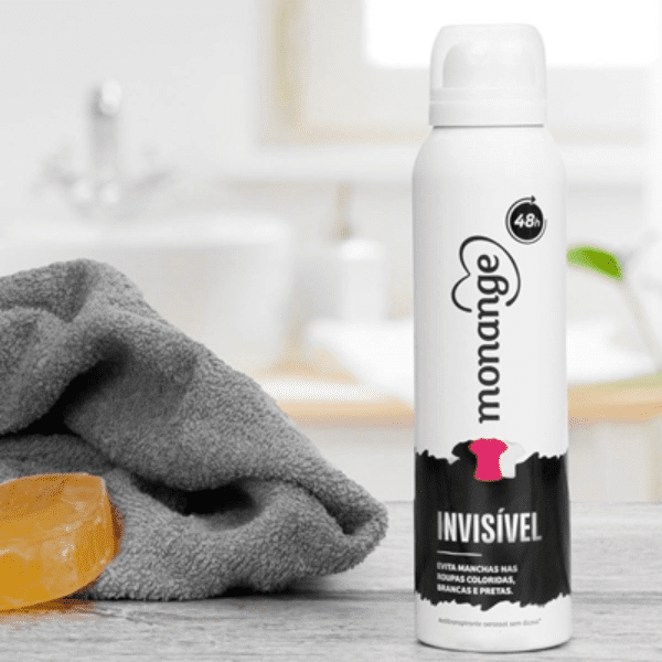 O Desodorante Antitranspirante Aerossol Monange Feminino Invisível possui tecnologia especial que evita manchas e acúmulos de resíduos nas axilas e em tecidos brancos, pretos e coloridos, além de nutrir até a 2ª camada da pele.
