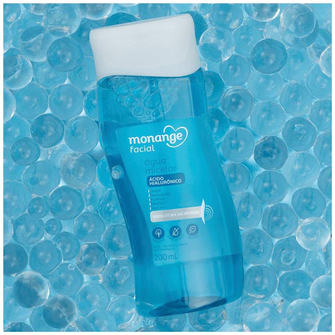 Indicada para todos os tipos de pele, a Água Micelar Monange Facial limpa, demaquila, purifica, tonifica e hidrata com o poder do Ácido Hialurônico.