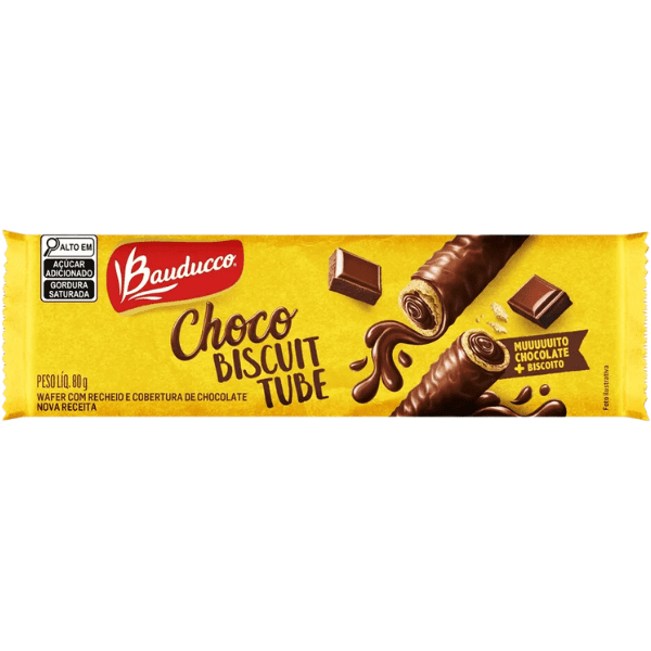 Wafer Recheio Chocolate Meio Amargo Cobertura Chocolate ao Leite Bauducco Choco Biscuit Tube.