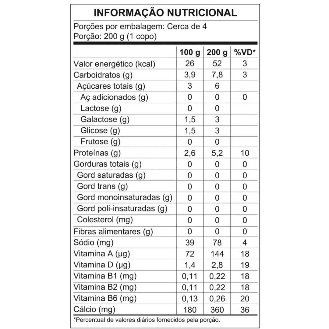 Rico em cálcio, também é fonte de vitaminas A, B1, B2, B6 e D. Sendo livre de lactose, também não conta com adição de açúcares e não possui gorduras.