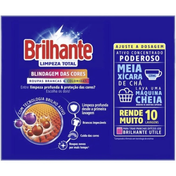 O sabão em pó Brilhante Limpeza Total além de limpar profundamente as suas roupas, tem a tecnologia de amaciante encapsulado que deixa os tecidos mais macios e perfumados.