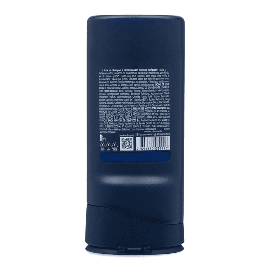 O Shampoo Antiqueda* 3×1 Bozzano proporciona fios macios e brilhosos com até 8x menos queda por quebra! Sua fórmula auxilia no fortalecimento dos fios, deixando-os mais saudáveis e resistentes, além de contar com ingredientes como Cafeína, Vitaminas E e B3. Indicado para uso diário. Aplique o shampoo nos cabelos molhados, massageando-os até formar espuma. Enxágue e repita a operação. Em seguida, aplique o condicionador e enxágue os cabelos novamente. Para melhores resultados utilize o condicionador da linha antiqueda* Bozzano para o cuidado com seus cabelos. * Queda por quebra. Resultado obtido por meio de teste com o uso associado do shampoo e condicionador após 10 aplicações.